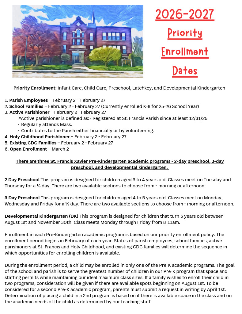 For more information about the St. Francis Xavier Child Development Center or Preschool program, email us at cdc@petoskeysfx.org